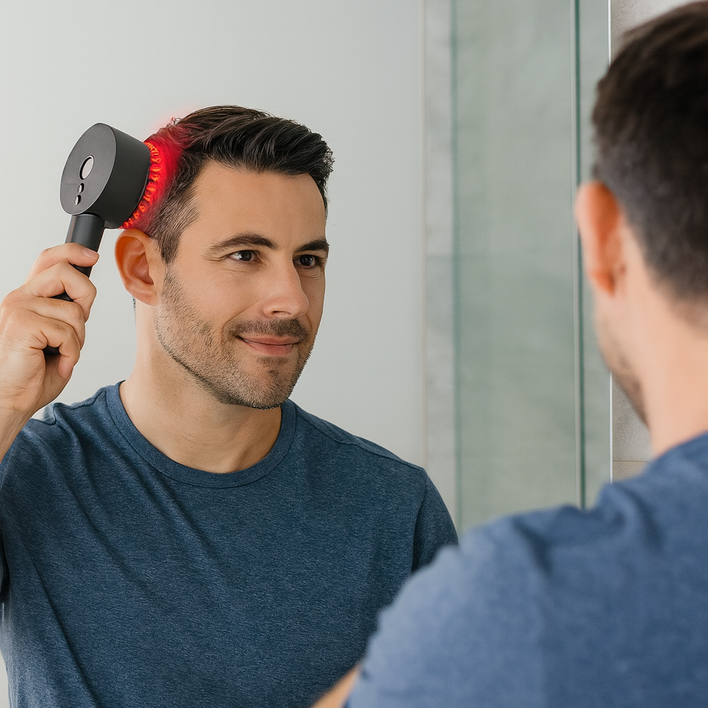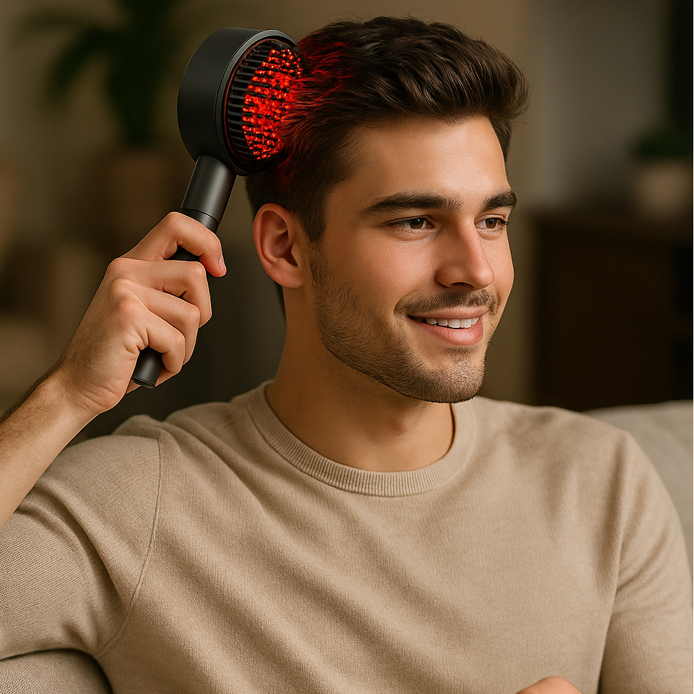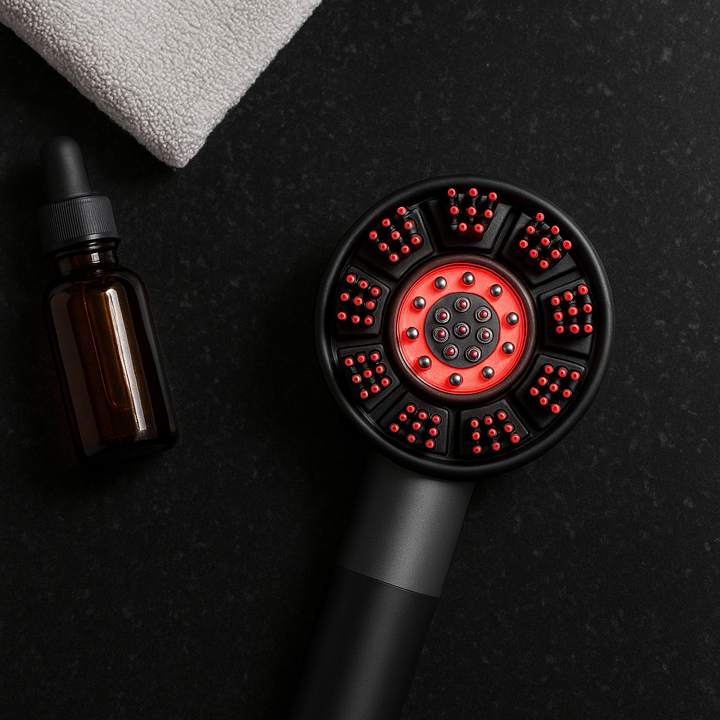 It combines three proven mechanisms — massage, red-light therapy, and serum infusion — which together stimulate blood flow, energize hair follicles, and nourish the scalp.